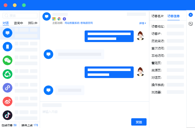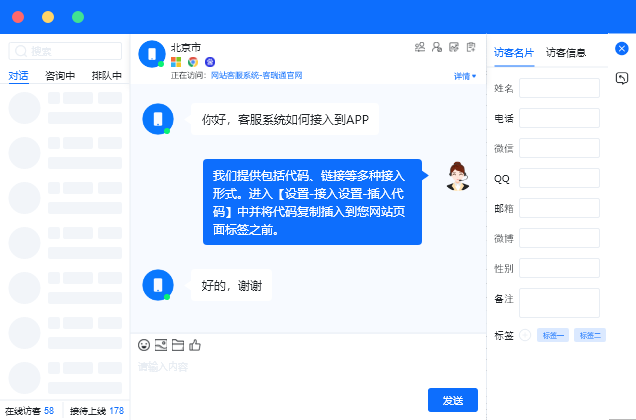 可以对访客信息进行备注,备注为熟客后系统将自动识别访客,并将访客咨询分配给最近对话的客服,降低沟通成本。