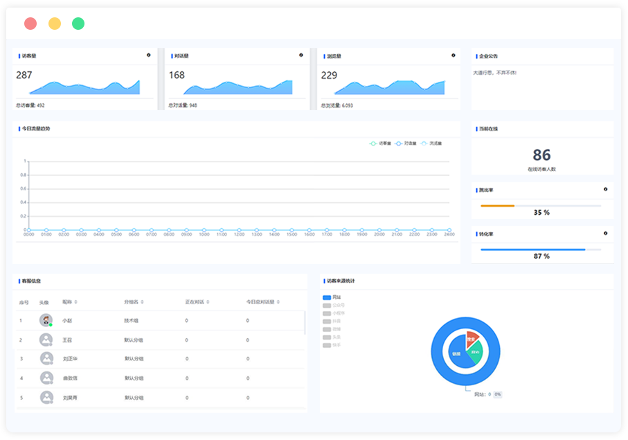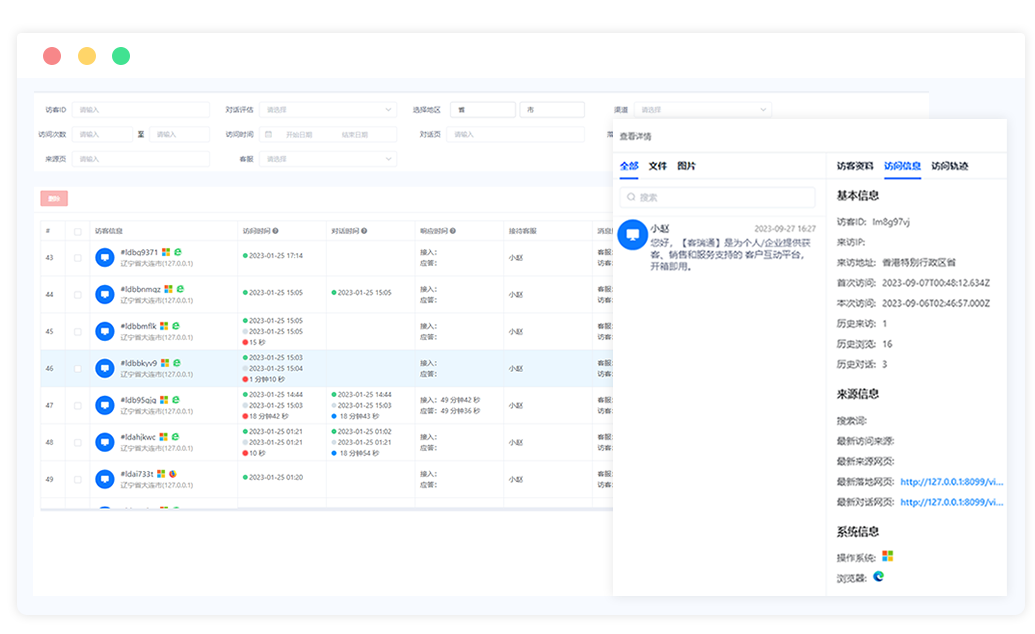 通过访客上线提醒、来源跟踪、来访时间、访问轨迹实现对访客的全方位动态监控,帮助企业分析产品关注度